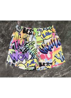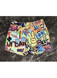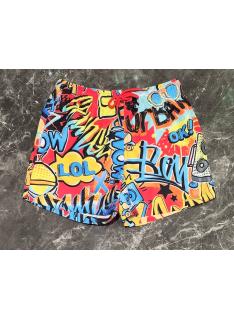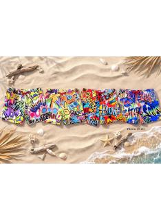 Short de bain garçon avec imprimé graffiti multicolore, taille confortable avec cordon de serrage contrasté et coupe pratique pensée pour la plage et la piscine.