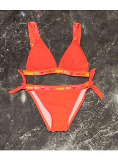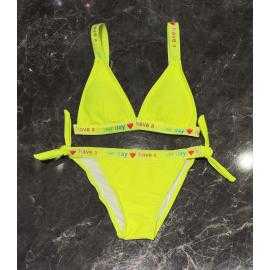 Maillot de bain fille 2 pièces avec haut triangle, fines bretelles et bande élastique contrastée. La culotte assortie possède des liens latéraux à nouer pour un ajustement confortable et un style estival moderne.