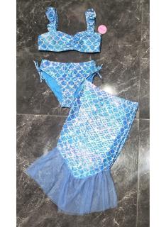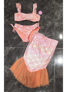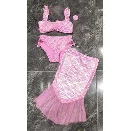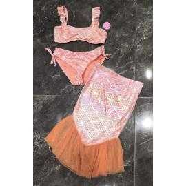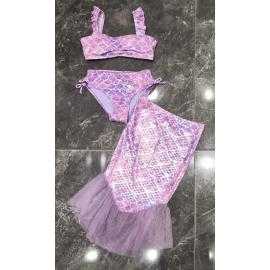 Maillot de bain fille 3 pièces composé d’un haut bandeau avec bretelles volantées, d’une culotte assortie avec liens latéraux et d’une jupe de plage avec finition en tulle. Le tissu brillant effet écailles apporte un style féerique inspiré de l’univers sirène.