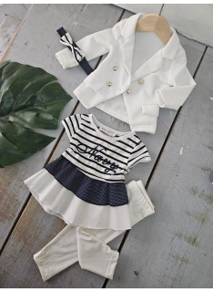 Ensemble bébé chic 4 pièces – Veste élégante, robe rayée, legging & bandeau