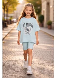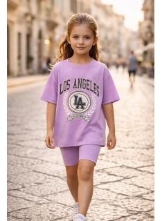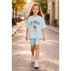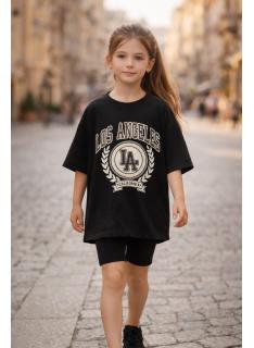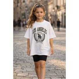 Le Haut : Un t-shirt à coupe large (oversize) avec une encolure ronde classique. Il arbore fièrement l'inscription "LOS ANGELES CALIFORNIA" dans une typographie de style "Varsity" (universitaire) contrastée sur la poitrine.