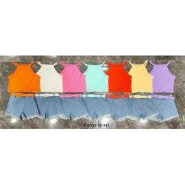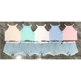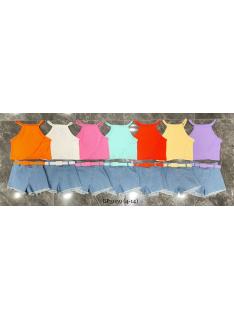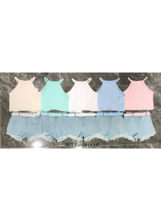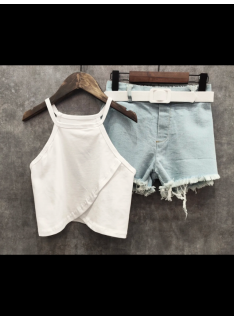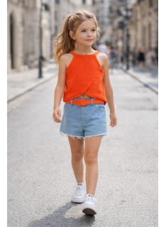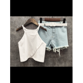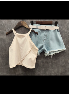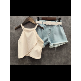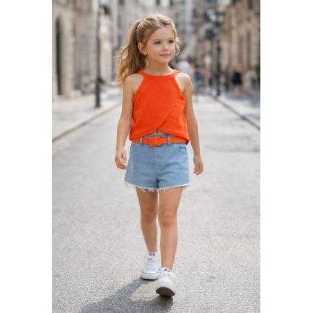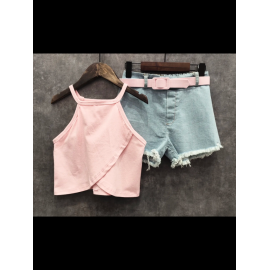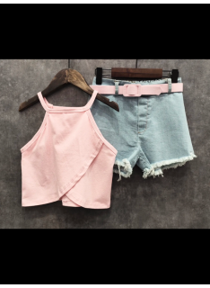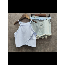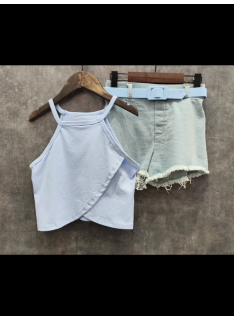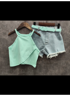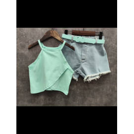 Ensemble fille tendance composé d’un débardeur uni coloré à fines bretelles et d’un short en jean avec ceinture assortie.