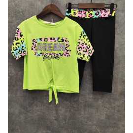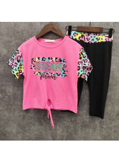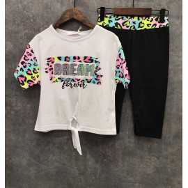 Le Haut : Un t-shirt à coupe droite avec un lien de serrage à la taille pour un effet cintré ou relax. Il comporte une inscription "DREAM Forever" scintillante et des manches contrastées avec un imprimé léopard multicolore (rose, bleu, jaune).