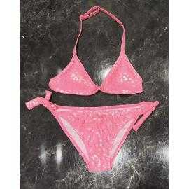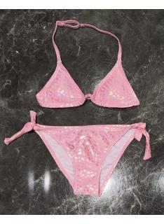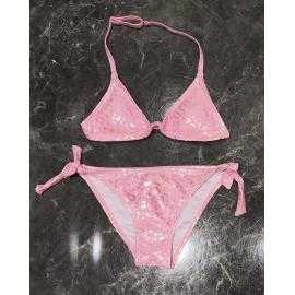 Maillot de bain fille 2 pièces composé d’un haut triangle avec fines bretelles réglables et d’une culotte assortie avec liens latéraux à nouer. Le tissu brillant apporte un effet lumineux et moderne parfaitement adapté à la saison estivale.
