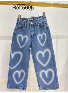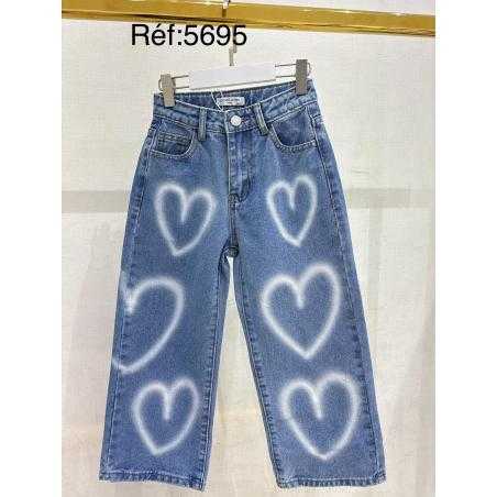 Jean fille coupe large avec motifs cœurs effet spray, apportant une touche moderne et originale à ce modèle.