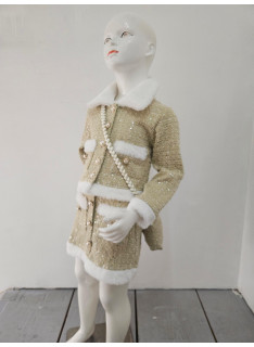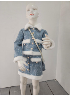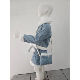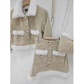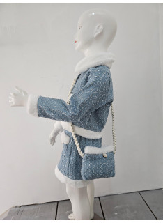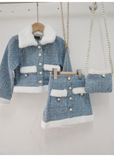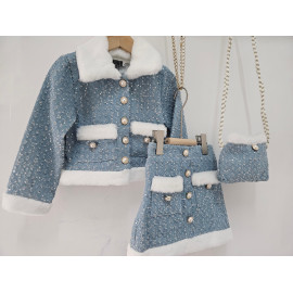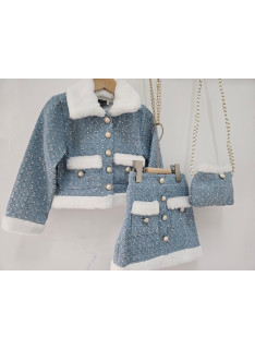 Cet ensemble coordonné est une pièce luxueuse d'inspiration chanel, idéale pour les fêtes, les cérémonies ou les grands événements. il est composé d'une veste et d'une mini-jupe assortie (et d'une pochette), confectionnées dans un tissu bleu ciel/gris clair de type tweed, enrichi de petites paillettes argentées pour un effet scintillant. le haut est une veste courte et structurée, fermée par des boutons bijoux (nacrés et dorés). le col, les bordures des poches et l'ourlet de la veste sont ornés d'une douce fourrure synthétique blanche ou crème, qui apporte chaleur et contraste. la mini-jupe trapèze est également ornée de la même fourrure synthétique au niveau de l'ourlet et sur les fausses poches avant. la jupe se ferme (probablement au dos) et est courte. l'ensemble est complété par une mini-sacoche assortie avec une bandoulière en chaîne dorée, offrant un look totalement coordonné. cette tenue est l'incarnation du chic hivernal, mêlant le classique tweed aux détails de paillettes et de fourrure.