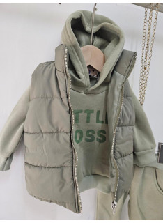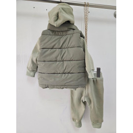 Le sweat à capuche affiche une inscription tendance sur la poitrine, apportant une touche streetwear moderne. Le pantalon, à taille élastique et finitions resserrées aux chevilles, garantit un confort optimal tout au long de la journée. La doudoune matelassée, zippée à l’avant, complète la tenue en ajoutant chaleur et praticité.