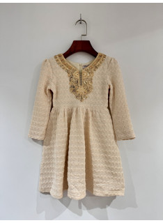 Party dress in textured fabric with embroidered gold sequin pattern on the collar.