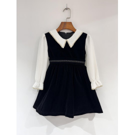 Bimaterial party dress in textured top in Claudine collar and velvet with a belt with beads.
