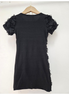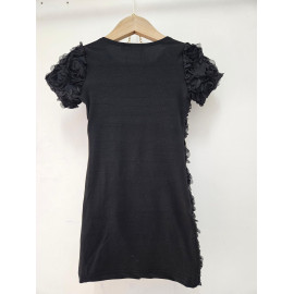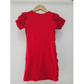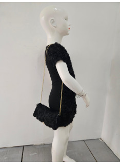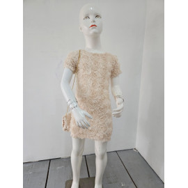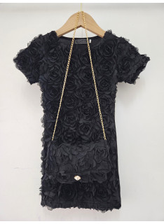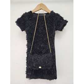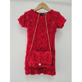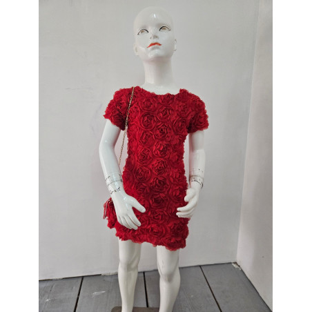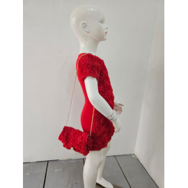 This dress is an extremely romantic and delicate ceremonial piece, perfect for special occasions such as weddings, baptisms or parties. it is made of a nude fabric, very pale pink or light champagne entirely covered with pink or three-dimensional flowers (3d), giving the dress a rich texture and a spectacular volume. the cut is a straight or short trapeze dress with a classic round neck and short sleeves that seem slightly puffy due to textured fabric. the dress is lined for optimal comfort and good fit. the set is completed by a matching mini shoulder bag, also covered with the same 3d floral fabric, and attached to a golden metal chain for a touch of luxury. the bag has a jewel button (pearl and rhinestone) for closing. this outfit offers a magical and sophisticated aesthetic, with a fully coordinated look.