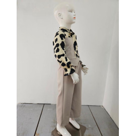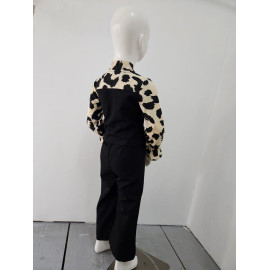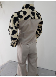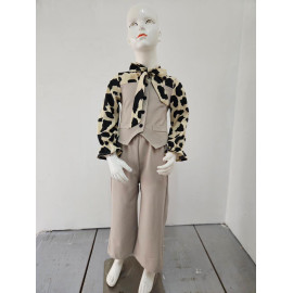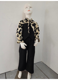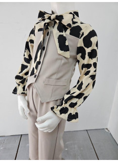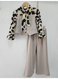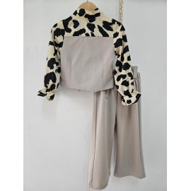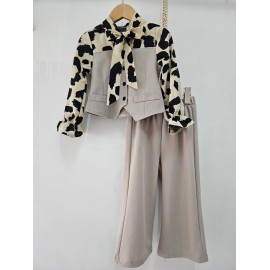 This two-piece set is a trendy and elegant, perfect outfit for a sophisticated and stylish look. It consists of a two-tone blouse creating a superimposed vest effect and matching pants. The blouse is structured: the body (vest) is in united black fabric, fitted, with decorative buttons and false pockets. Long sleeves are made in a clear cream or light beige fluid fabric with a black abstract leopard pattern (large spots) that brings a dynamic contrast. The collar is enhanced with a lavallière (ribbon) in the same leopard pattern, which can be knotted in a large knot for a chic look or let loose. The bottom is an assorted black black pants (probably in stretch or crepe fabric), straight or wide cut, with a structured size for a net rendering. The set offers a bold style, mixing the classic black / white with animal print statement.