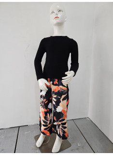 This two-piece set is a modern mix of comfort and bold patterns. The top is a long sleeve and round neck with a single black ribbed mesh, offering a fitted and versatile cut. The ribbed fabric brings a subtle texture and ensures a good outfit. The bottom is a palazzo cut trousers (wide leg), made in a fluid and lightweight fabric. Its design is characterized by an abstract floral print consisting of large spots in bright black tones, off-white, burn orange and fishing, creating a striking contrast with the united black high. The pants feature an elasticated size for easy threading and maximum comfort. This set is ideal for a stylish everyday look that does not sacrifice the ease of movement, mixing the chic basic on the ground statement.