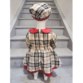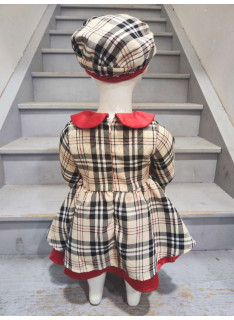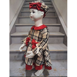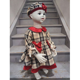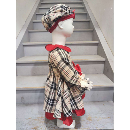 Its beige and black plaid pattern is enhanced by Shining red keys : a claudine collar in velvet, of pretty decorative knots at the waist, and a contrasting hem which brings volume and charm to the silhouette. Lightly puffy long sleeves are embellished with small ribbons, adding a delicate and feminine touch.