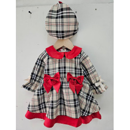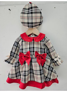Baby chip dress with red knots and matching beret.