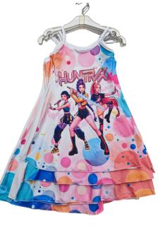 Colorful and trendy girls summer dress featuring the popular Huntrix print loved by children.