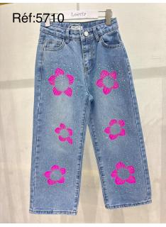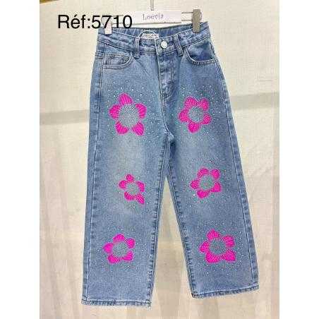 Girls wide jeans featuring decorative flowers with rhinestone details for a bright and trendy look.