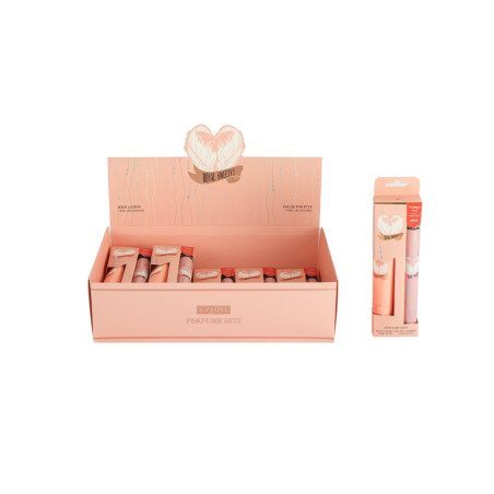 10x Female fragrance box including 35 ml eau de toilette and a body lotion 35 ml. Fragrance soft, floral and romantic, inspired by an iconic feminine perfume both delicate and elegant. Ideal for resale and gift boxes.