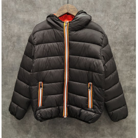 Het heeft een geribde kraag, manchetten en tailleband met zwarte en witte strepen, die de atletische geest versterken. Het sluit met zwarte drukknopen aan de voorkant.