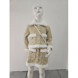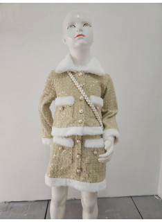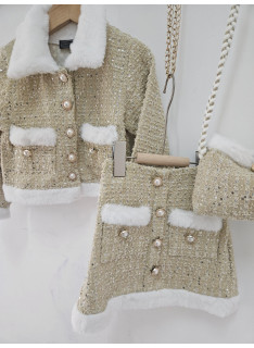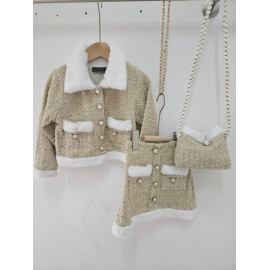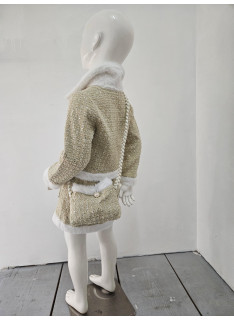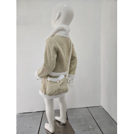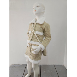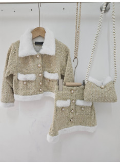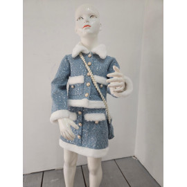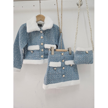 Deze gecoördineerde set is een luxe kamer van inspiratie Chanel, ideaal voor feesten, ceremonies of grote evenementen. Het is samengesteld uit een jas en een bijpassende minirok (en een buidel), gemaakt in een blauwe lucht / tweed grijze stof, verrijkt met kleine zilveren pailletten voor een glinsterend effect. De bovenkant is een kort en gestructureerd jasje, gesloten door juwelenknoppen (pearly en gouden). De nek, de grenzen van de zakken en de zoom van de jas zijn versierd met een zachte witte of crème synthetische vacht, die warmte en contrast brengt. De minirok van Trapeze is ook ingericht met dezelfde synthetische vacht op het zoom en de valszakken. De rok sluit (waarschijnlijk op de achterkant) en is kort. De set wordt aangevuld met een bijpassende mini-tas met een gouden keten schouderriem, met een volledig gecoördineerde look. Deze outfit is de incarnatie van de winter chic, het mengen van de klassieke tweed met glitter- en bontdetails.