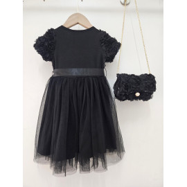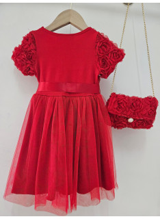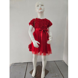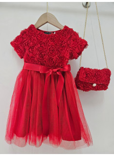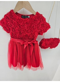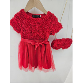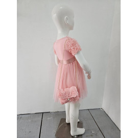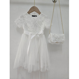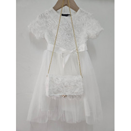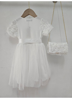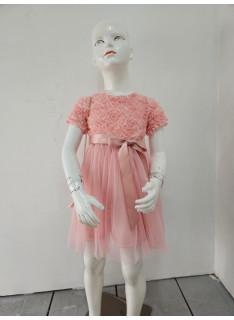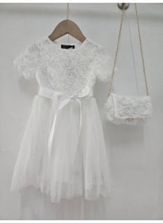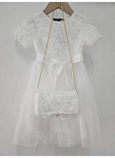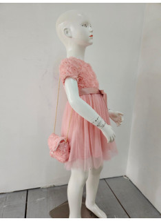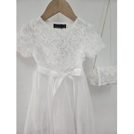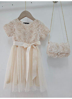Deze jurk is een uiterst romantische en delicate ceremonie kledingstuk, perfect voor speciale gelegenheden zoals bruiloften, doopjes of feesten. het is bedekt met een naakt, zeer licht roze of lichte champagne stof die volledig bedekt is met rozen- of bloempatronen in drie dimensies (3d), waardoor de jurk een rijke textuur en een spectaculair volume heeft. de cut is een korte rechte jurk of trapeze met een klassieke ronde hals en korte mouwen die enigszins opgezwollen lijken vanwege de textuur. de jurk is gevouwen voor optimale kleding en een goed uiterlijk. het geheel is bekleed met een mini-schuim, ook bedekt met hetzelfde 3d-florale weefsel, en vastgebonden aan een gouden metalen ketting voor een touchscreen. de zak is voorzien van een sierknop (parel en rhinestone) voor het sluiten. deze kleding heeft een wonderbaarlijke en verfijnde esthetiek, met een volledig gecoördineerde look.
