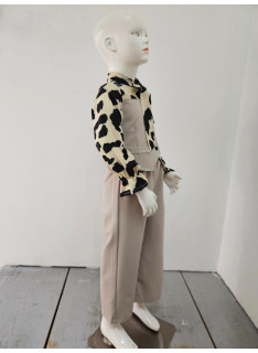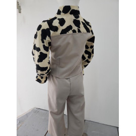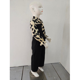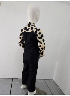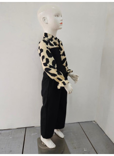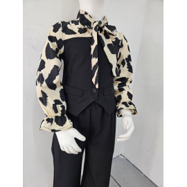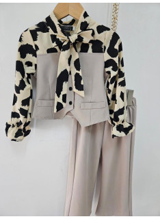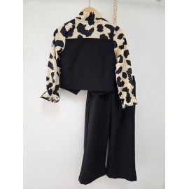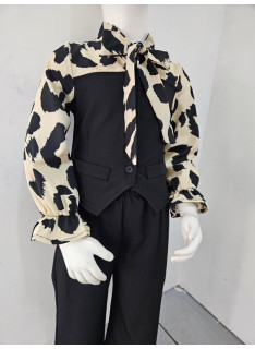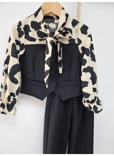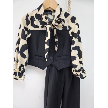 Deze tweedelige set is een trendy en elegante, perfecte outfit voor een verfijnde en stijlvolle uitstraling. Het bestaat uit een tweekleurige blouse die een gesuperponeerd vest-effect en bijpassende broek maakt. De blouse is gestructureerd: het lichaam (vest) is in United Black Weefsel, gemonteerd, met decoratieve knoppen en valse zakken. Lange mouwen zijn gemaakt in een duidelijke room of lichte beige vloeistofstof met een zwart abstract luipaardpatroon (grote vlekken) die een dynamisch contrast brengt. De kraag is verbeterd met een lavallière (lint) in hetzelfde luipaardpatroon, dat kan worden geknoopt in een grote knoop voor een chique blik of loslaten. De bodem is een geassorteerde zwarte zwarte broek (waarschijnlijk in stretch of crêpe stof), rechte of brede snit, met een gestructureerde grootte voor een netto-rendering. De set biedt een gedurfde stijl, mengt het klassieke zwart / wit met dierenprint verklaring.