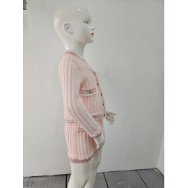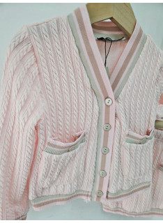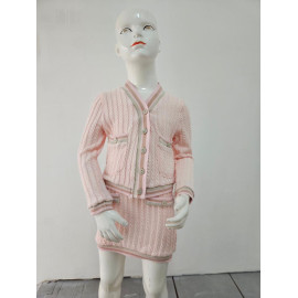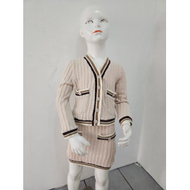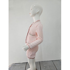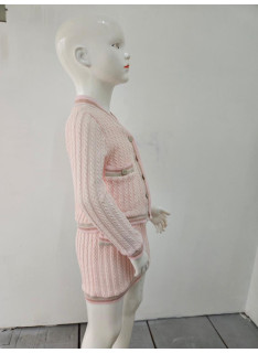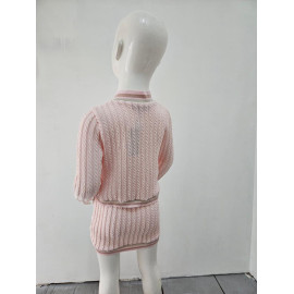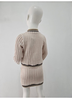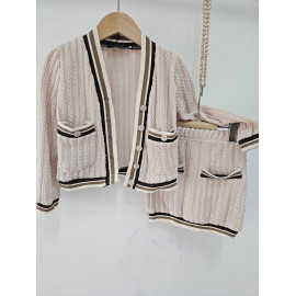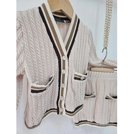 Deze tweedelige set is een elegante en comfortabele outfit van inspiratie preppy of universiteit. Het wordt gebreid in een flexibel en heet gaas met een patroon van gedraaide of verticale vlechten die een rijke textuur toevoegt. De hoofdkleur is een erg bleke, naakt of lichte beige roos. Het vest heeft een enigszins korte snede en sluit met knoppen. Het is verbeterd met contrasterende strepen (bruin, donkerbruin en wit) bij de V-hals, de knop, polsen en zoom. Het heeft ook twee valse decoratieve zakken aan de voorkant. De bijpassende minirok (of korte rok, de korte snede) heeft dezelfde verticale verdraaide en eindigt met een bijpassende gestreepte zoom. Het is ook ingericht met kleine knopen aan de voorkant, in hetzelfde gestreepte patroon. Deze set is perfect voor een chique herfst / winterlook, waarbij het comfort van het gaas wordt gecombineerd met een zeer nette en gecoördineerde stijl.