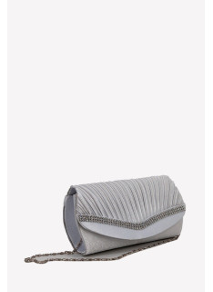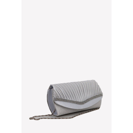 Een avondzak en ceremoniële zak van zilveren satin gevouwen met strass.