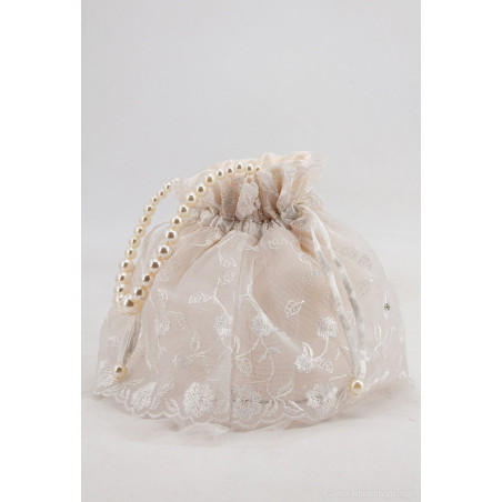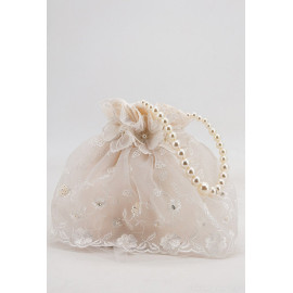 Avond- en ceremonietasje van ivoorkleurige geborduurde tule met een handvat met kralen.