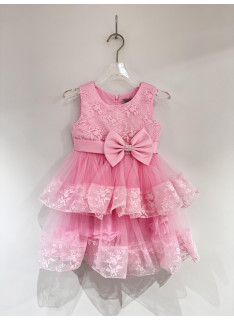 Een feestjurk van tulle en bloemenborduurwerk met een knoopgordel.