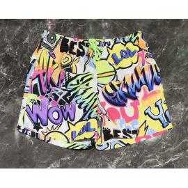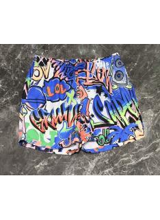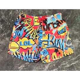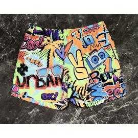 Stijlvolle jongens zwemshort met meerkleurige graffiti print, comfortabele taille met contrasterend trekkoord en praktische pasvorm voor strand- en zwembadactiviteiten.