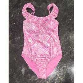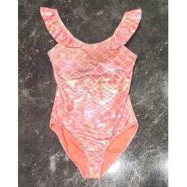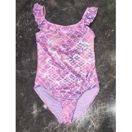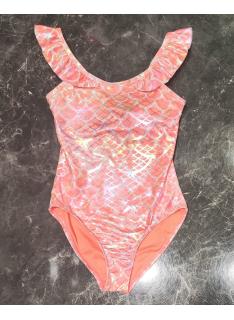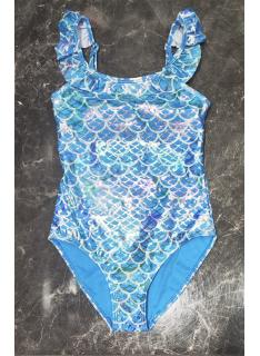 Stijlvol meisjes badpak met glanzend schubbenpatroon geïnspireerd op de zeemeermin stijl. De bandjes met ruches geven het model een speelse en elegante uitstraling.