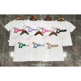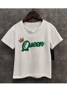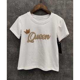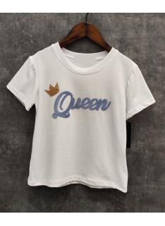 Trendy meisjes t-shirt met korte mouwen en Queen opdruk in blauwe reliëfletters.